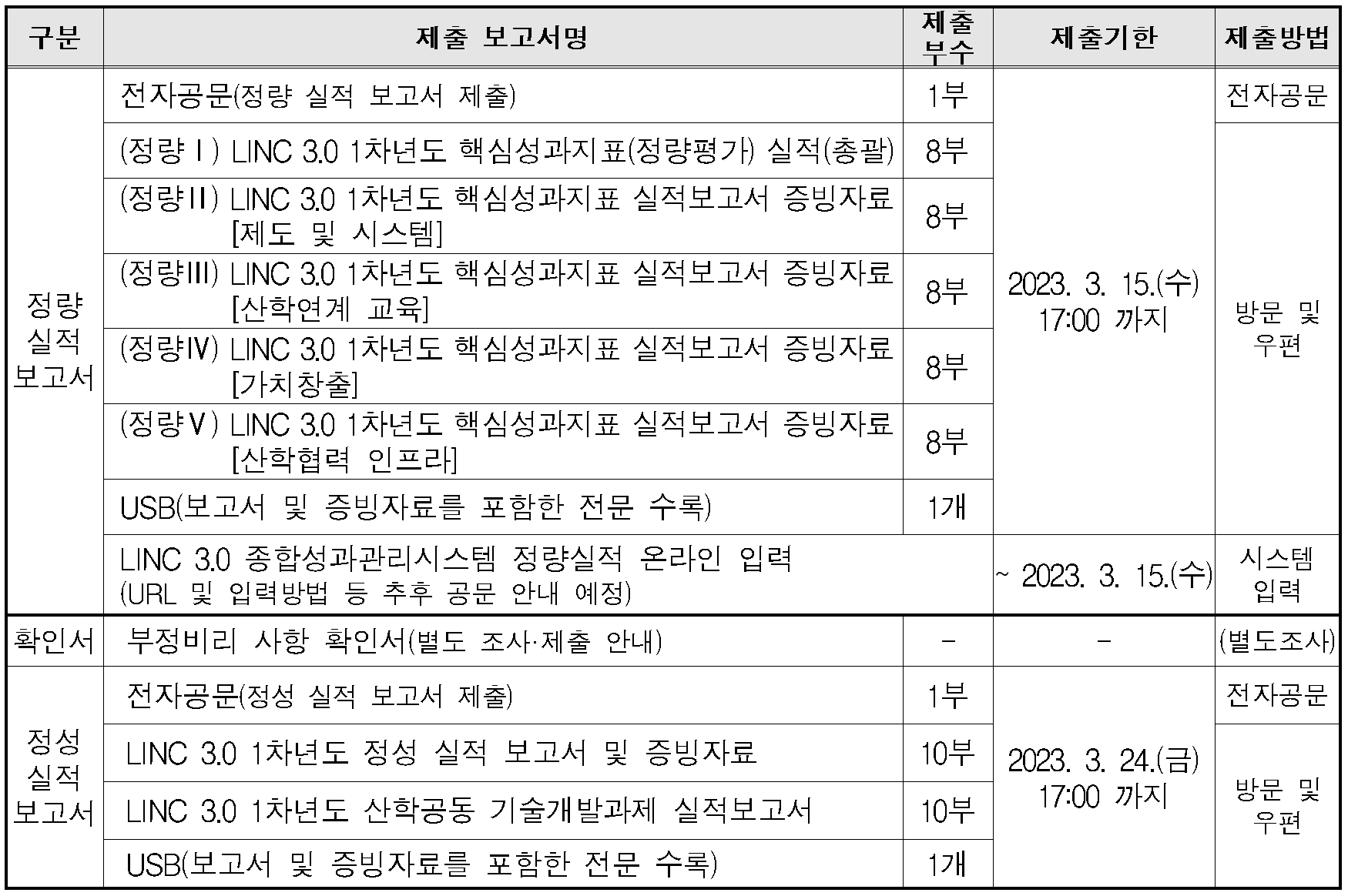 「3단계 산학연협력 선도대학 육성사업(LINC 3.0)」 1차년도 사업 실적보고서 제출 관련 사항을 다음과 같이 안내드립니다.