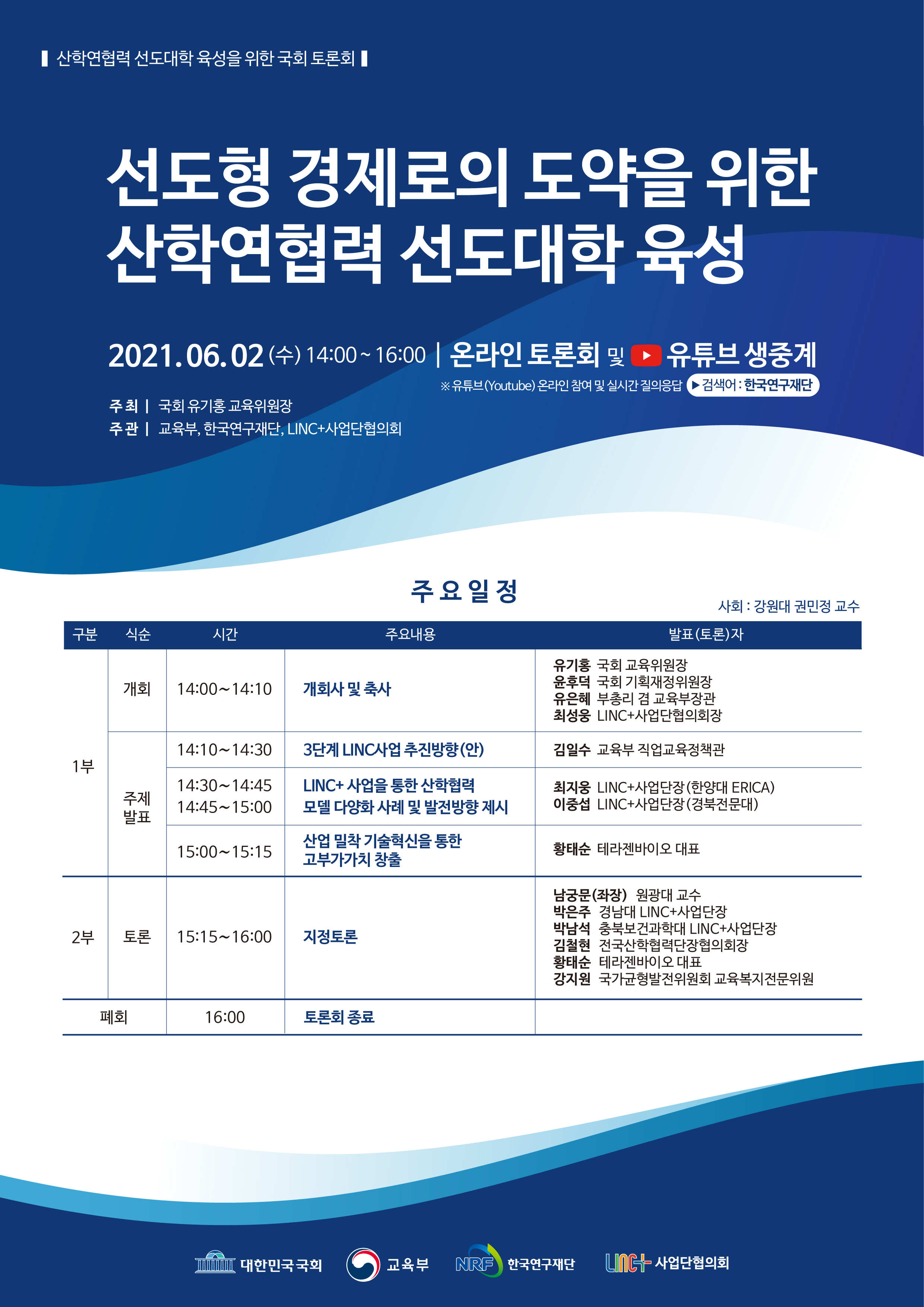 산학연협력 선도대학 육성을 위한 국회 토론회가 '선도형 경제로의 도약을 위한 산학연협력 선도대학 육성'을 주제로